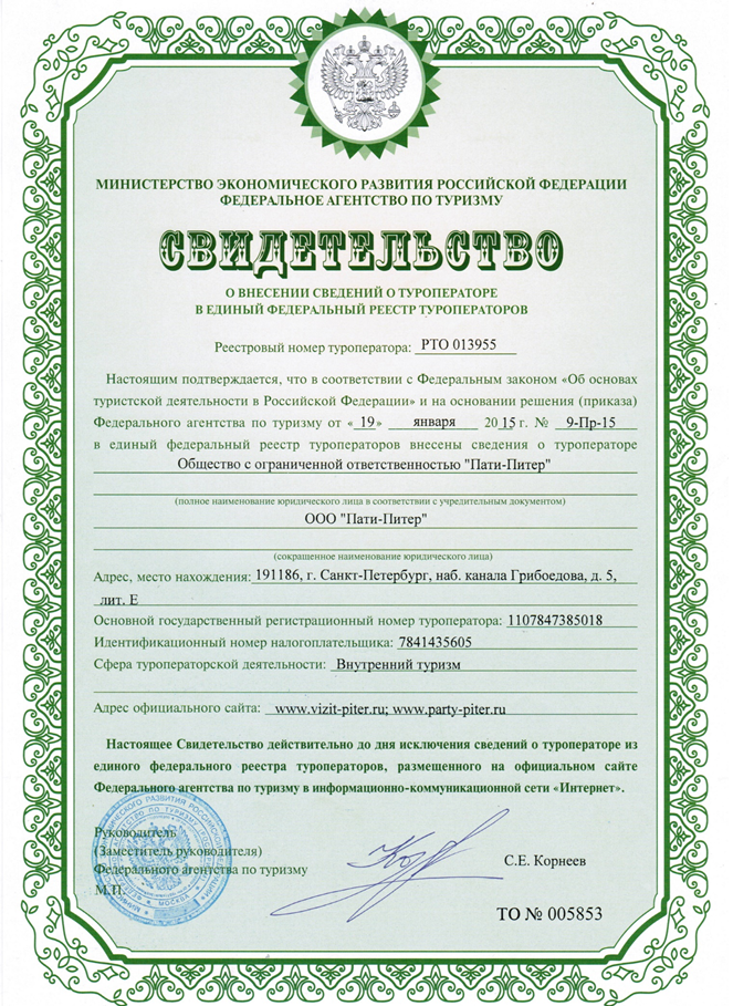 Дата приказа Ростуризма о внесении сведений в единый федеральный реестр туроператоров: